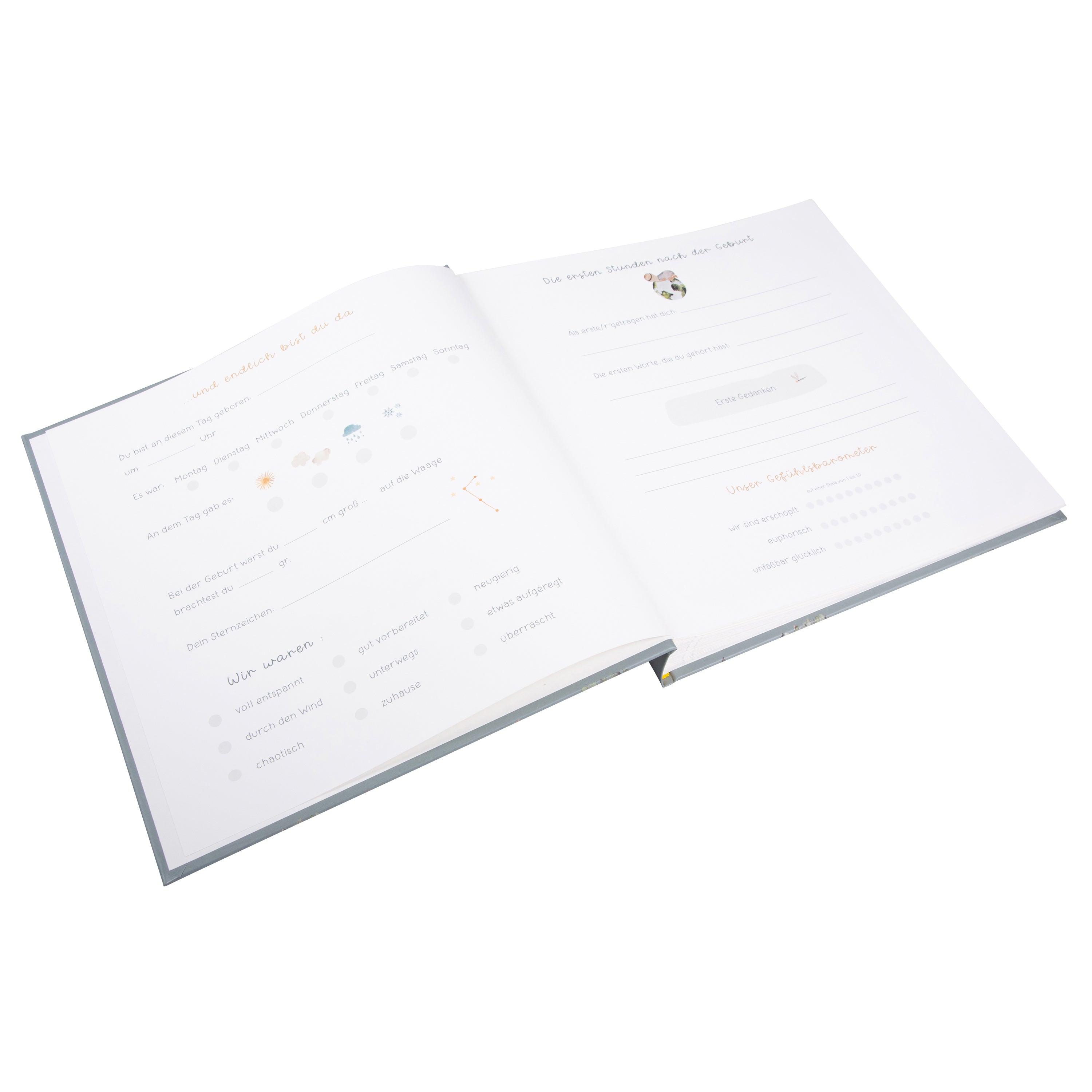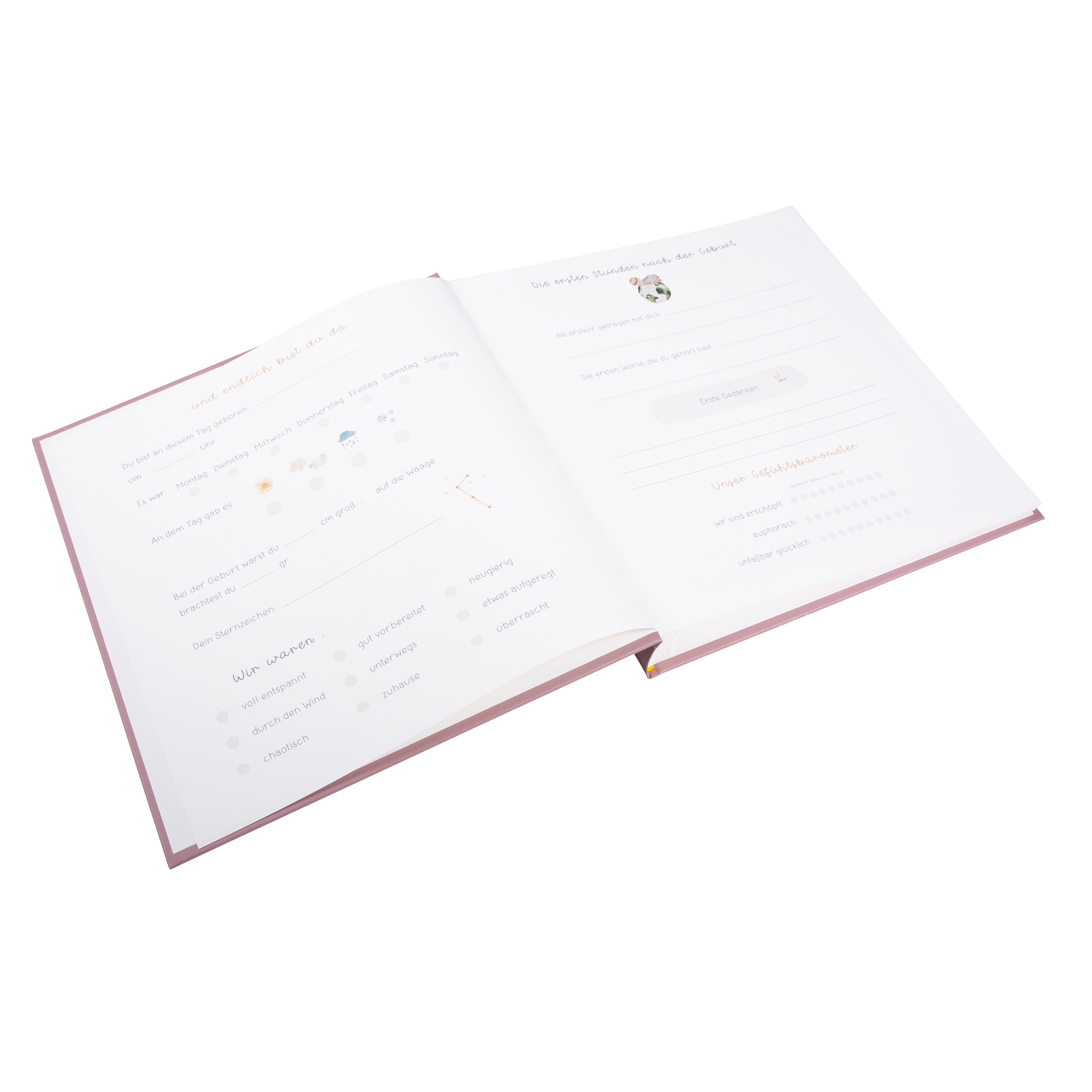 Ein besonderes Extra: 6 lose, farbig illustrierte Seiten, die ganz individuell eingeklebt werden können. So entsteht ein einzigartiges Erinnerungsstück, das genau so individuell ist wie das kleine Wunder selbst.