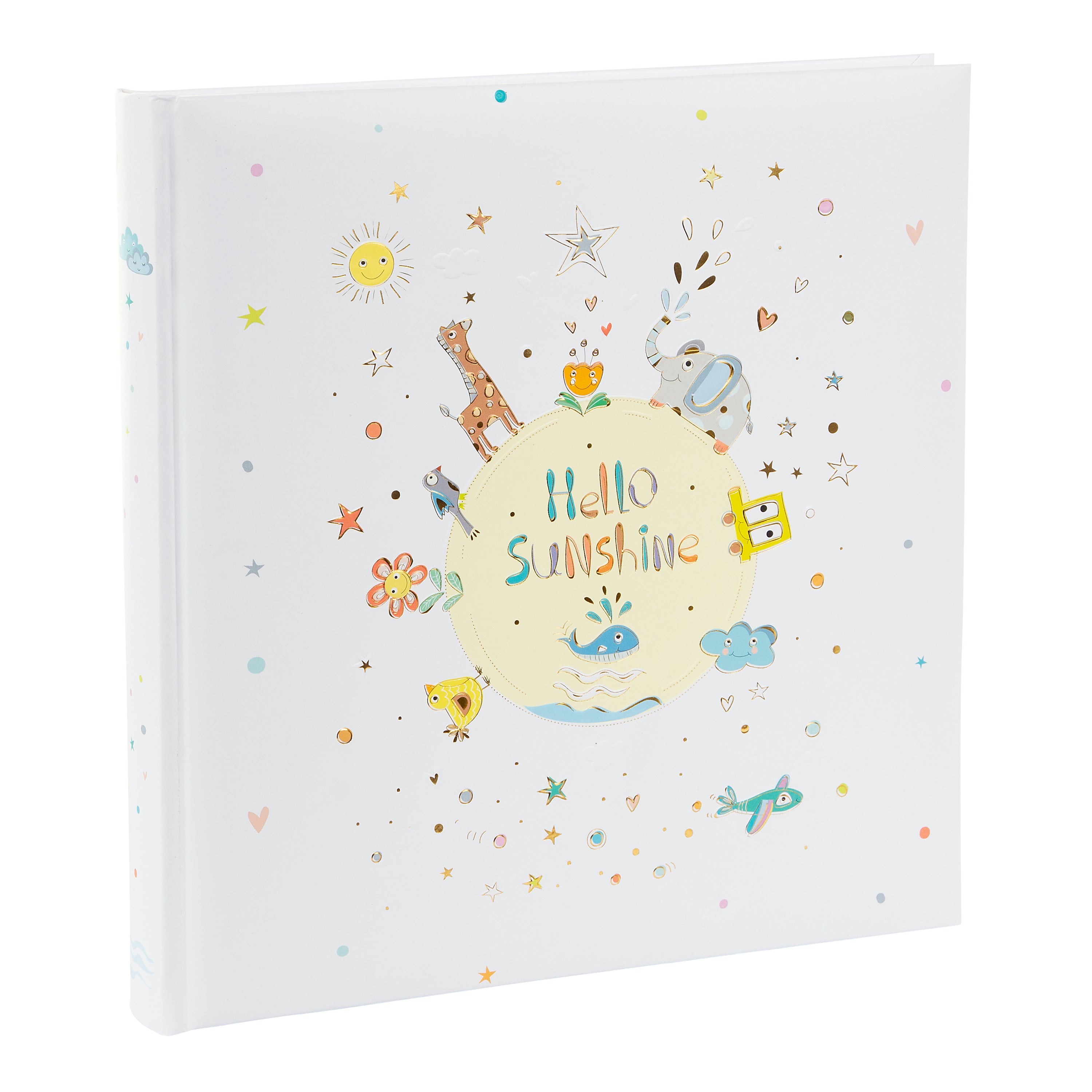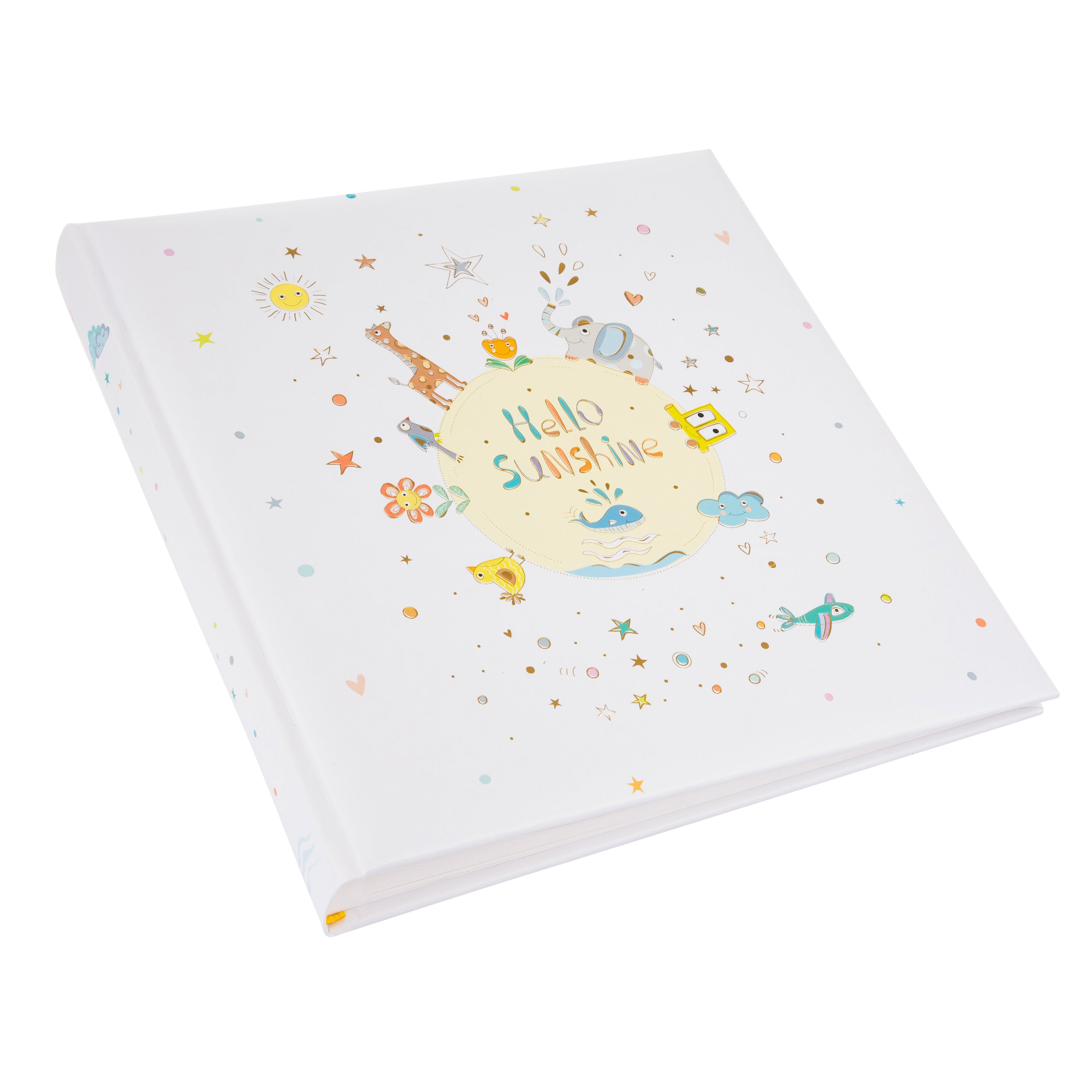 Das Babyalbum Hello Sunshine bringt gute Laune auf jede Seite! Das fröhliche Design zeigt eine strahlende Sonne, eine Giraffe, einen Elefanten, kleine Vögel und viele verspielte Details wie Herzen und Sterne in sanften, harmonischen Farbtönen. Der hochwertige Kunstdruckeinband mit Goldprägung und fühlbarem Relief verleiht dem Album eine besondere Haptik – ein echtes Schmuckstück, das man gerne in den Händen hält.